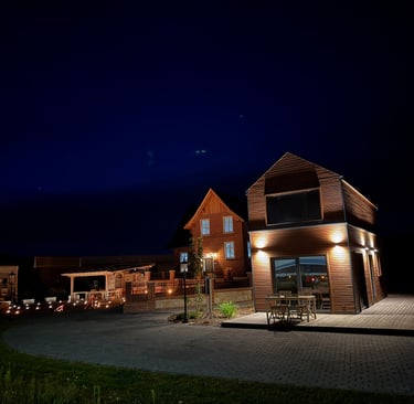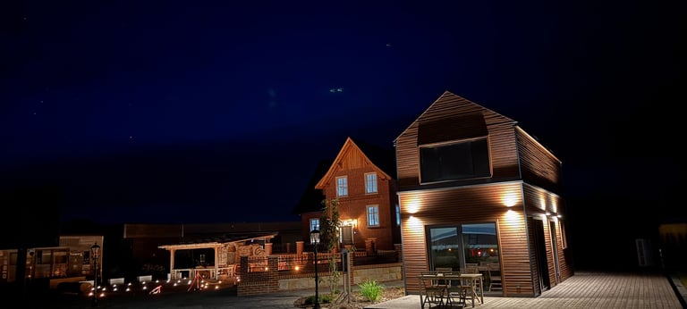 führt der Weg über den Vintage Wintergarten, vorbei am Solarcarport mit Ladesäulen und dem kreativen Micro House, vorüber am Hobbymodul – Raum für Freizeit, Kreativität & Genuss hin zur Hauptterrasse mit der überdachten Vintage Terrasse. Von dort geht es weiter zum Tinyhouse „Rock the Tiny“, und schließlich zum Science Cube, in dem sich demnächst das Podcast Studio befindet – ein Ort, an dem Ideen nicht nur gedacht, sondern auch gehört werden.